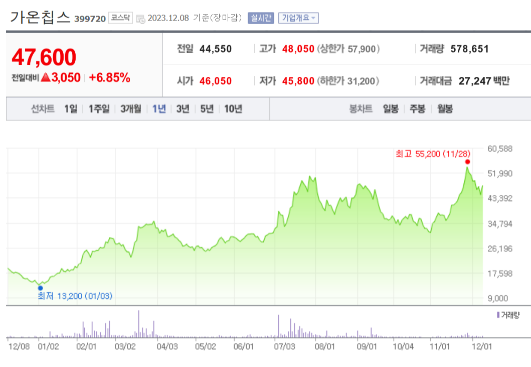 가온칩스는 반도체 및 관련장비 기업으로 주가는 47,600원이며 전일 대비 +6.85%의 모습을 보이고 있습니다. 가온칩스의 주주현황을 살펴보면 정규동(외 9인)이 지분 56.83%를 소유하고 있습니다. 가온칩스의 시가 총액은 5468억 원이며 발행 주식수는 11,488,320주 입니다. 외국인 보유 비중은 4.77% 이며 장중 거래량은 11,488,320를 기록했습니다. 매출액은 427억 원, 영업이익은 39억 원을 달성했습니다. EPS는 418원이며 BPS는 4,999원 입니다.