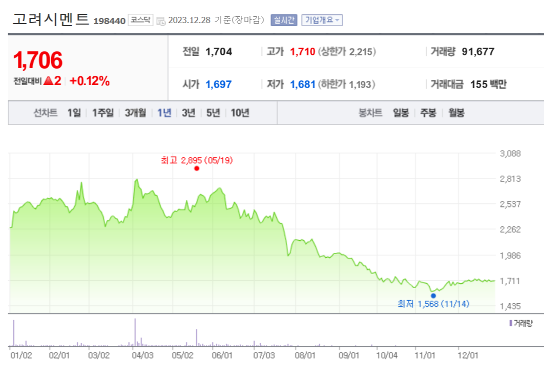 이 글에서는 고려시멘트 주가 전망과 목표 주가, 기업 정보에 대해서 설명합니다. 주식 시장에서 중요한 것은 미래의 기업 가치를 예측하고 선제적으로 움직이는 것입니다. 투자할 종목을 고르기 전에 현재 기업의 현황과 데이터를 확인하는 것이 필요합니다. 고려시멘트 주식의 주요 현황과 투자 정보를 확인하시고 주식 투자에 유용한 자료들을 정리하여 제공하오니 효율적인 투자를 해보세요.