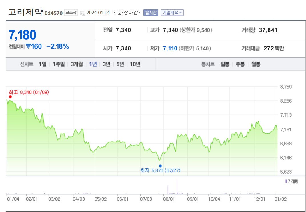 이 글에서는 고려제약 주가 전망과 목표 주가, 기업 정보에 대해서 설명합니다. 주식 거래에서 중요한 부분은 현재 기업 가치보다는 미래의 기업 가치를 예측하고 먼저 행동하는 것입니다. 투자할 종목을 고르기 전에 현재 기업의 상황과 지표를 살펴보는 것이 중요합니다. 고려제약 주식의 주요 현황과 투자 정보를 확인하시고 주식 투자에 도움을 줄 자료들을 모아 두었으니 투자 결정에 도움을 받으시길 바랍니다.