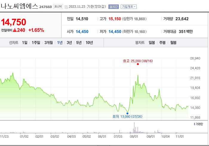 나노씨엠에스는 화학 기업으로  현재 주가는 14,750원이며 전일 대비 +1.65%의 모습을 보이고 있습니다. 나노씨엠에스의 주주현황을 살펴보면 김시석(외 6인)이 지분 28.40%를 소유하고 있습니다. 나노씨엠에스의 시가 총액은 641억 원이며 발행 주식수는 4,343,920주 입니다. 외국인 보유 비중은 0.94% 이며 장중 거래량은 23,642를 기록했습니다. 매출액은 18억 원, 영업이익은 6억 원을 달성했습니다. EPS는 -738원 입니다.
