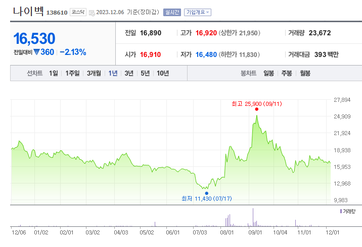 나이벡는 의료 장비 및 서비스 기업으로 주가는 16,530원이며 전일 대비 -2.13%의 모습을 보이고 있습니다. 나이벡의 주주현황을 살펴보면 정종평(외 6인)이 지분 21.98%를 소유하고 있습니다. 나이벡의 시가 총액은 1646억 원이며 발행 주식수는 9,957,479주 입니다. 외국인 보유 비중은 1.33% 이며 장중 거래량은 23,672를 기록했습니다. 매출액은 111억 원, 영업이익은 6억 원을 달성했습니다. EPS는 -1,018원이며 BPS는 3,391원 입니다.