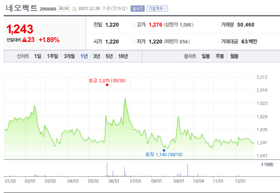 네오펙트 현재 주가는 1,243원이며 전일 대비 +1.89%의 모습을 보이고 있습니다. 네오펙트의 주주현황을 살펴보면 스칸디 신기술조합 제278호 주주가 전체 지분 24.49%를 소유하고 있습니다. 네오펙트는 의료 장비 및 서비스 기업으로 시가 총액은 435억 원이며 발행 주식수는 35,019,194주 입니다. 외국인 보유 비중은 0.46% 이며 장중 거래량은 50,460을 기록했습니다. 매출액은 201억 원을 달성했습니다. EPS는 -252원이며 BPS는 410원 입니다.