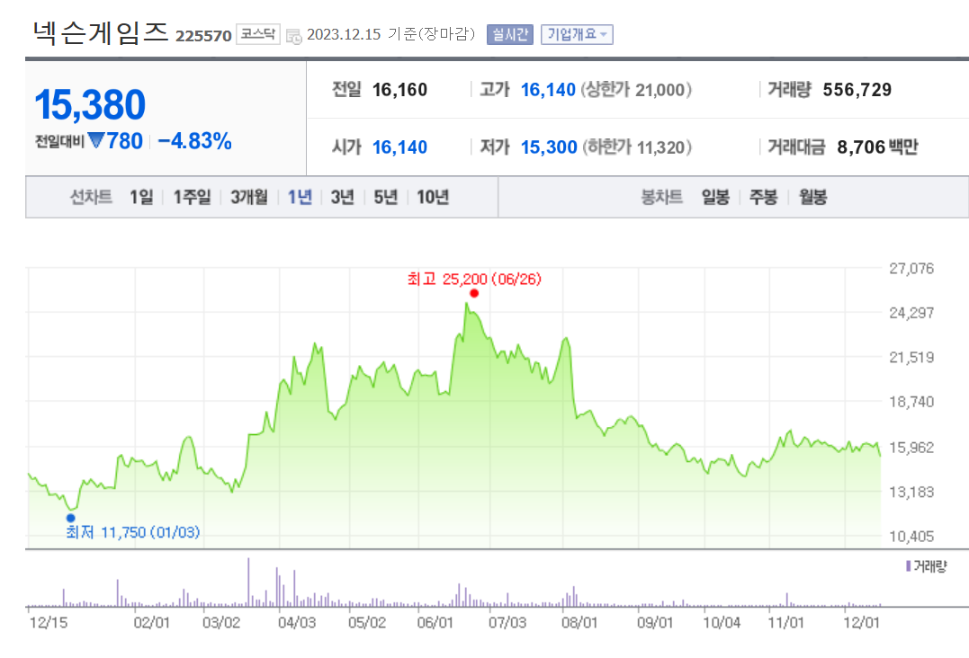 넥슨게임즈 현재 주가는 15,380원이며 전일 대비 -4.83%의 모습을 보이고 있습니다. 넥슨게임즈의 주주현황을 살펴보면 넥슨코리아(외 1인)이 지분 63.44%를 소유하고 있습니다. 넥슨게임즈는 게임 소프트웨어 기업으로 시가 총액은 1조119억 원이며 발행 주식수는 65,794,770주 입니다. 외국인 보유 비중은 3.78% 이며 장중 거래량은 556,729를 기록했습니다. 매출액은 1,521억 원, 영업이익은 52억 원을 달성했습니다. EPS는 309원이며 BPS는 4,166원 입니다.