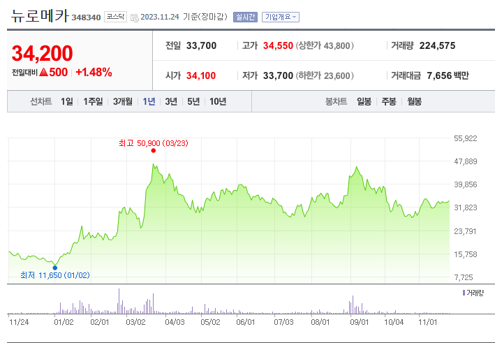 뉴로메카는 기계 기업으로 현재 주가는 34,200원이며 전일 대비 +1.48%의 모습을 보이고 있습니다. 뉴로메카의 주주현황을 살펴보면 박종훈(외 3인)이 지분 22.46%를 소유하고 있습니다. 뉴로메카장의 시가 총액은 3573억 원이며 발행 주식수는 10,446,270주 입니다. 외국인 보유 비중은 0.11% 이며 장중 거래량은 224,575를 기록했습니다. 매출액은 40억 원, 영업이익은 -78억 원을 달성했습니다. EPS는 -931원이며 BPS는 3,459원 입니다.