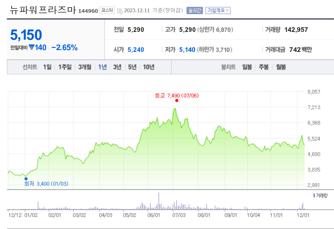 뉴파워프라즈마는 반도체 및 관련장비 기업으로 주가는 5,150원이며 전일 대비 -2.65%의 모습을 보이고 있습니다. 뉴파워프라즈마의 주주현황을 살펴보면 최대규(외 5인)이 지분 36.43%를 소유하고 있습니다. 뉴파워프라즈마의 시가 총액은 2250억 원이며 발행 주식수는 43,692,624주 입니다. 외국인 보유 비중은 4.75% 이며 장중 거래량은 142,957을 기록했습니다. 매출액은 2,485억 원, 영업이익은 141억 원을 달성했습니다. EPS는 264원이며 뉴파워프라즈마 주식 배당수익률은 0.97%% 입니다.
