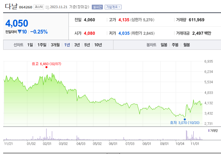 다날는 인터넷 서비스 기업으로 장마감 기준 주가는 4,050원이며 전일 대비 -0.25%의 모습을 보이고 있습니다. 다날의 주주현황을 살펴보면 박성찬(외 2인)이 지분 17.67%를 소유하고 있습니다. 다날의 시가 총액은 2792억 원이며 발행 주식수는 68,949,040주 입니다. 외국인 보유 비중은 7.11% 이며 장중 거래량은 611,969를 기록했습니다. 매출액은 1,459억 원, 영업이익은 -28억 원을 달성했습니다. EPS는 -158원입니다.