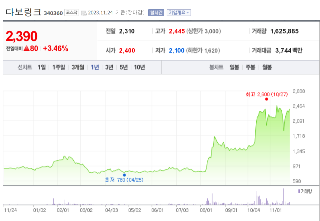 다보링크는 통신장비 기업으로 주가는 2,390원이며 전일 대비 +3.46%의 모습을 보이고 있습니다. 다보링크의 주주현황을 살펴보면 이용화(외 13인)이 지분 38.98%를 소유하고 있습니다. 다보링크의 시가 총액은 1022억 원이며 발행 주식수는 42,765,160주 입니다. 외국인 보유 비중은 2.17% 이며 장중 거래량은 1,625,885를 기록했습니다. 매출액은 536억 원, 영업이익은 -29억 원을 달성했습니다. EPS는 -73원이며 동일업종 등락률은 -0.47을 나타냈습니다.