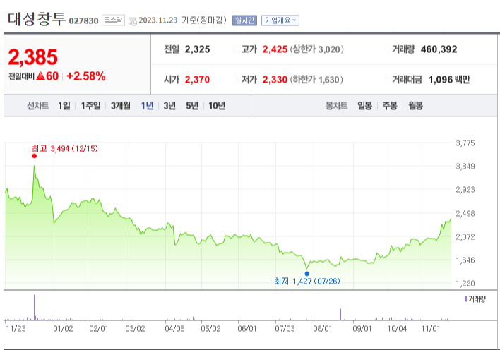 대성창투는 창업투자 및 종금 기업으로 주가는 2,385원이며 전일 대비 +2.58%의 모습을 보이고 있습니다. 대성창투의 주주현황을 살펴보면 대성홀딩스(외 1인)이 지분 51.74%를 소유하고 있습니다. 대성창투장의 시가 총액은 1288억 원이며 발행 주식수는 54,000,000주 입니다. 외국인 보유 비중은 1.26% 이며 장중 거래량은 460,392를 기록했습니다. 매출액은 46억 원, 영업이익은 억 원을 달성했습니다. EPS는 -51원이며 BPS는 1514원 입니다.