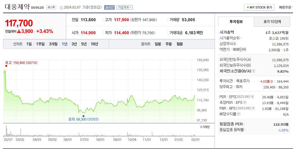 대웅제약은 현재 주가가 117,700원이며 전일 대비 +3.43% 상승한 상태입니다. 대웅제약의 주주 구성은 대웅(외 5인)이 지분의 61.55%를 소유하고 있습니다. 대웅제약은 제약 기업으로서, 시가 총액은 1조 2826억 원이며, 발행 주식수는 11,586,575주입니다. 외국인 보유 비중은 9.83%이며, 장중 거래량은 53,005주를 기록했습니다. 또한, 대웅제약은 매출액으로 10,135억 원을 달성했습니다.