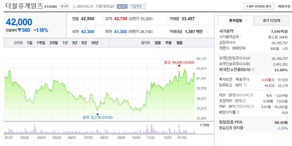 더블유게임즈의 현재 주가는 42,000원이며 전일 대비 -1.18%으로 하락하고 있습니다. 주주현황을 살펴보면 김가람(외 6인)이 지분의 44.54%를 소유하고 있습니다. 더블유게임즈는 게임 소프트웨어 기업으로, 시가 총액은 7640억 원이며 발행 주식수는 18,190,757주입니다. 외국인 보유 비중은 13.20%이며, 장중 거래량은 33,457주를 기록했습니다. 또한 매출액은 4,289억 원을 달성했습니다.