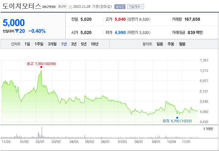 도이치모터스는 자동차 기업으로 주가는 5,000원이며 전일 대비 -0.40%의 모습을 보이고 있습니다. 도이치모터스의 주주현황을 살펴보면 권오수(외 2인)이 지분 33.65%를 소유하고 있습니다. 도이치모터스의 시가 총액은 1609억 원이며 발행 주식수는 32,181,550주 입니다. 외국인 보유 비중은 5.31% 이며 장중 거래량은 167,658를 기록했습니다. 매출액은 16,168억 원, 영업이익은 648억 원을 달성했습니다. EPS는 374원이며 도이치모터스 주식 배당수익률은 7.20% 입니다.