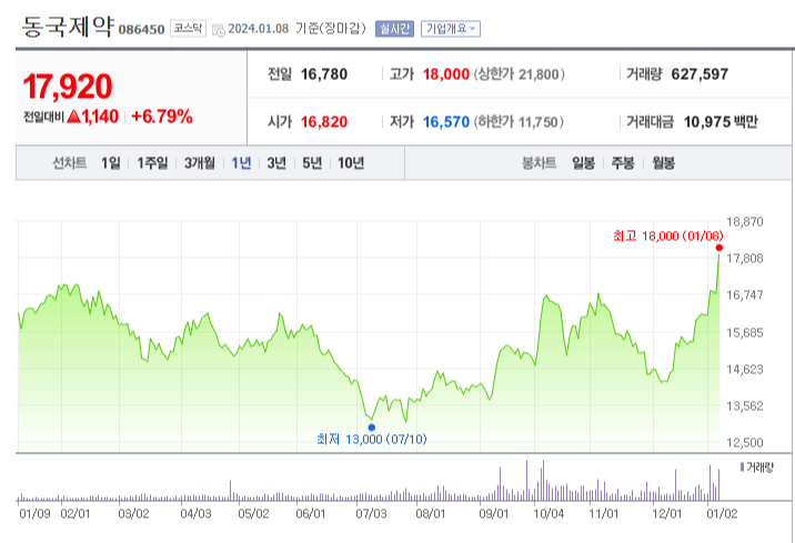 동국제약 현재 주가는 17,920원이며 전일 대비 +6.79%의 모습을 보이고 있습니다. 동국제약의 주주현황을 살펴보면 권기범 주주가 전체 지분 45.77%를 소유하고 있습니다. 동국제약는 제약 기업으로 시가 총액은 7967억 원이며 발행 주식수는 44,460,000주 입니다. 외국인 보유 비중은 15.75% 이며 장중 거래량은 627,597을 기록했습니다. 매출액은 5,431억 원을 달성했습니다. EPS는 1,050원이며 BPS는 11,959원 입니다.