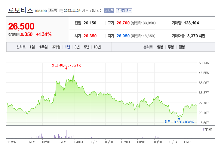 로보티즈는 기계 기업으로  현재 주가는 26,500원이며 전일 대비 +1.34%의 모습을 보이고 있습니다. 로보티즈의 주주현황을 살펴보면 김병수(외 2인)이 지분 31.67%를 소유하고 있습니다. 로보티즈의 시가 총액은 3383억 원이며 발행 주식수는 12,766,717주 입니다. 외국인 보유 비중은 1.22% 이며 장중 거래량은 128,104를 기록했습니다. 매출액은 138억 원, 영업이익은 -22억 원을 달성했습니다. EPS는 37원이며 BPS는 7,171원 입니다.