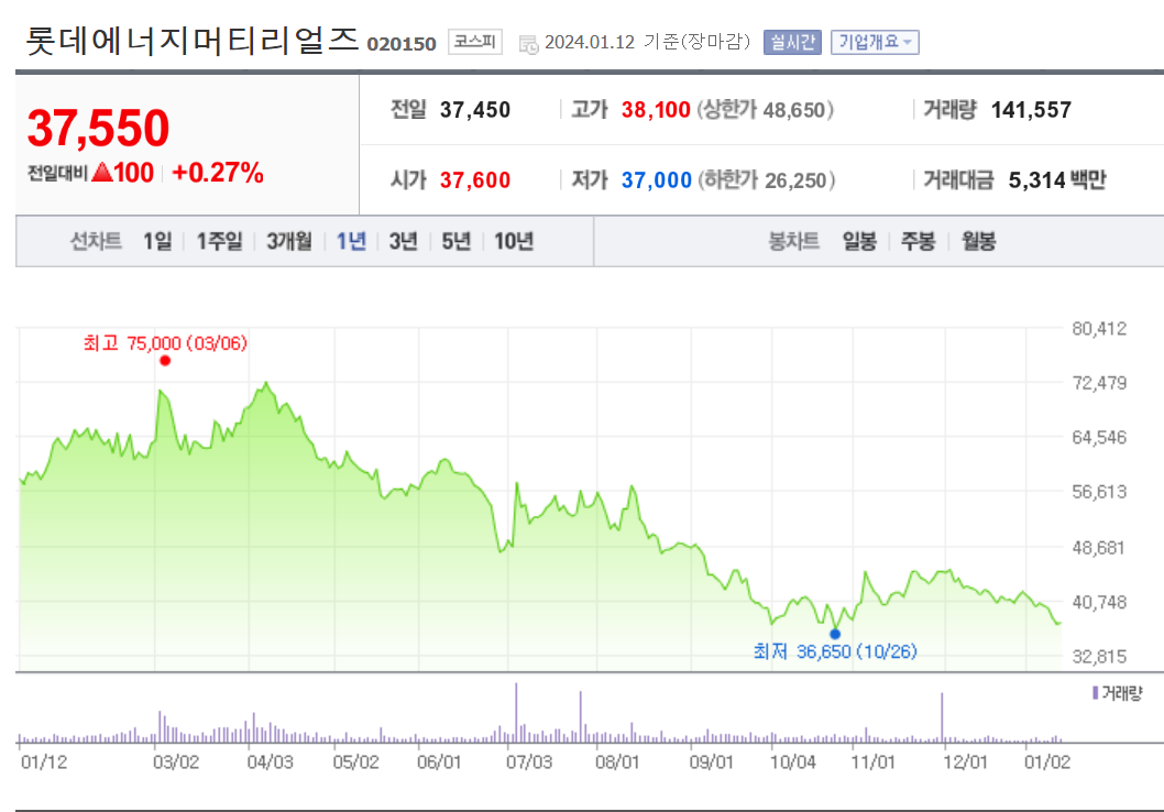 롯데에너지머티리얼즈의 현재 주가는 37,550원이며 전일 대비 +0.27%의 상승세를 보이고 있습니다. 롯데에너지머티리얼즈의 대주주는 롯데케미칼(외 7인)으로 지분의 53.32%를 소유하고 있습니다. 이 회사는 전자 장비 및 기기 분야에서 활동하고 있으며, 시가 총액은 1조7315억의 코스피 154위 기업입니다. 발행 주식수는 46,110,835주입니다. 외국인 보유 비중은 9.12%이며, 장중 거래량은 141,557을 기록했습니다. 또한, 이 회사의 매출액은 5,795억 원을 달성했습니다.