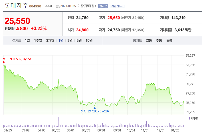롯데지주는 대한민국의 종합 거래소에 상장되어 있는 대표적인 재벌 중 하나로, 롯데그룹의 지주회사입니다. 주요 사업 분야로는 유통, 호텔, 금융, 제조 등이 있으며, 롯데그룹의 다양한 계열사들을 관리하고 지원합니다. 롯데지주는 국내외에서 다양한 사업을 전개하고 있으며, 특히 롯데마트, 롯데호텔 등을 통해 유통 및 호텔업 분야에서 성공적인 성과를 거두고 있습니다. 또한, 롯데카드, 롯데손해보험 등을 통해 금융 분야에서도 활발한 경영을 이어가고 있습니다. 롯데지주는 안정적인 경영과 성장 가능성이 높은 기업으로 평가되고 있으며, 주식 시장에서도 많은 투자자들의 관심을 받고 있습니다.