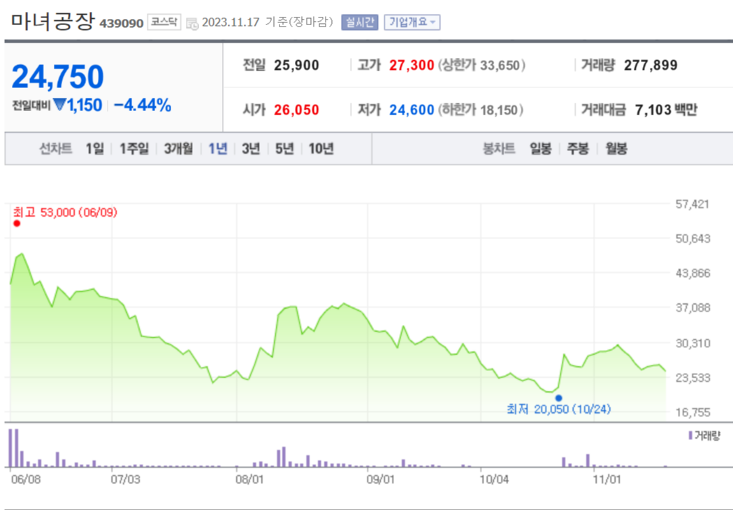 마녀공장는 개인생활용품 기업으로 주가는 24,750원이며 전일 대비 -1,150원의 모습을 보이고 있습니다. 마녀공장의 주주현황을 살펴보면 엘앤피코스메틱(외 14인)이 지분 70.54%를 소유하고 있습니다. 마녀공장의 시가 총액은 4054억 원이며 발행 주식수는 277,899주 입니다. 외국인 보유 비중은 0,14% 이며 장중 거래량은 277,899를 기록했습니다. 매출액은 736억 원, 영업이익은 245억 원을 달성했습니다. EPS는 1,225원입니다.