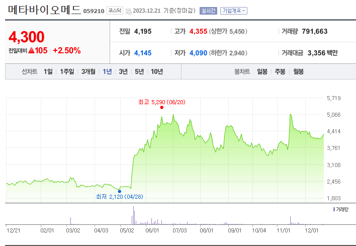 메타바이오메드 현재 주가는 4,300원이며 전일 대비 +2.50%의 모습을 보이고 있습니다. 메타바이오메드의 주주현황을 살펴보면 오석송 주주가 전체 지분 23.51%를 소유하고 있습니다. 메타바이오메드는 의료 장비 및 서비스 기업으로 시가 총액은 1026억 원이며 발행 주식수는 23,862,351주 입니다. 외국인 보유 비중은 7.17% 이며 장중 거래량은 791,663을 기록했습니다. 매출액은 618억 원을 달성했습니다. EPS는 308원이며 메타바이오메드 주식 배당수익률은 0.47% 입니다.