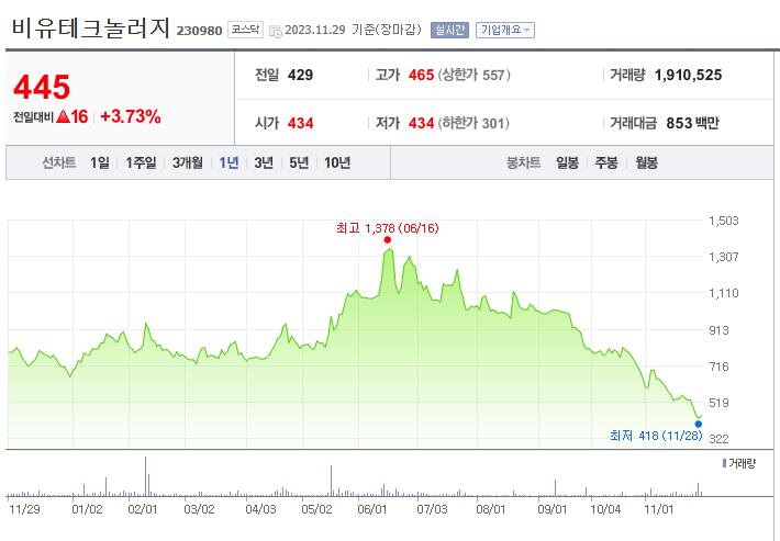 비유테크놀러지는 일반 소프트웨어 기업으로 현재 주가는 445원이며 전일 대비 +3.73%의 모습을 보이고 있습니다. 비유테크놀러지의 주주현황을 살펴보면 이 지분 10.82%를 소유하고 있습니다. 비유테크놀러지의 시가 총액은 371억 원이며 발행 주식수는 83,448,078주 입니다. 외국인 보유 비중은 1.14% 이며 장중 거래량은 1,910,281를 기록했습니다. 매출액은 86억 원, 영업이익은 -68억 원을 달성했습니다. EPS는 -410원이며 BPS는 106원 입니다.