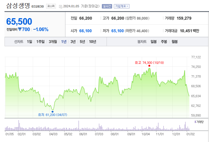삼성생명 현재 주가는 65,500원이며 전일 대비 -1.06%의 모습을 보이고 있습니다. 삼성생명의 주주현황을 살펴보면 삼성물산 주주가 전체 지분 45.30%를 소유하고 있습니다. 삼성생명는 보험 기업으로 장중 기준으로 시가 총액은 13조1000억 원이며 발행 주식수는 200,000,000주 입니다. 외국인 보유 비중은 16.99% 이며 장중 거래량은 159,279를 기록했습니다. 매출액은 233,321억 원을 달성했습니다. EPS는 12,499원이며 BPS는 238,297원 입니다.