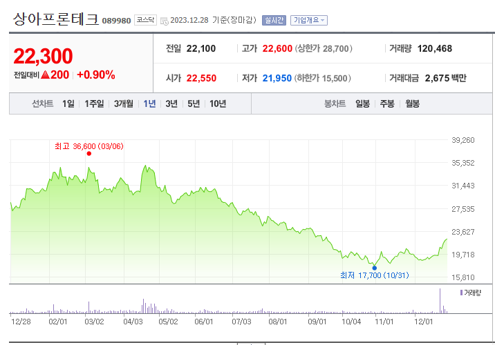 상아프론테크 현재 주가는 22,300원이며 전일 대비 +0.90%의 모습을 보이고 있습니다. 상아프론테크의 주주현황을 살펴보면 이상원 주주가 전체 지분 42.42%를 소유하고 있습니다. 상아프론테크는 전자 장비 및 기기 기업으로 시가 총액은 3566억 원이며 발행 주식수는 15,989,037주 입니다. 외국인 보유 비중은 2.34% 이며 장중 거래량은 205,835원 을 기록했습니다. 매출액은 1,419억 원을 달성했습니다. EPS는 163원이며 상아프론테크 주식 배당수익률은 0.90% 입니다.