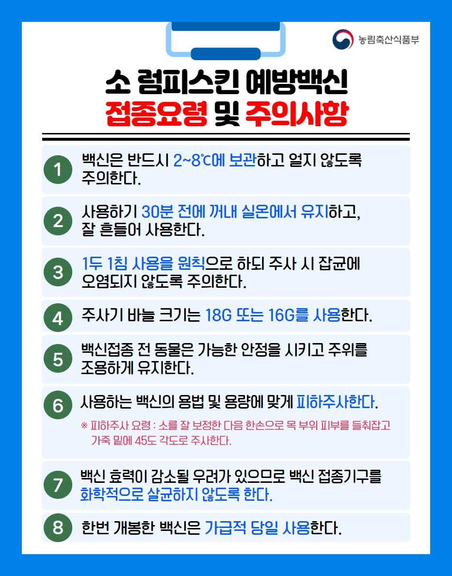 럼피스킨 백신은 수의사의 지도하에 접종되어야 합니다. 수의사는 적절한 접종 기술과 접종 부위를 안내할 것입니다.