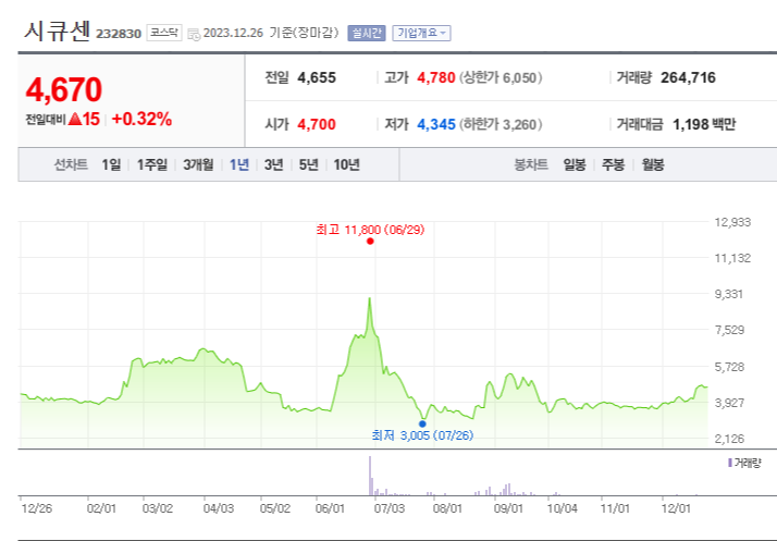 시큐센 현재 주가는 4,670원이며 전일 대비 +0.32%의 모습을 보이고 있습니다. 시큐센의 주주현황을 살펴보면 콤텍시스템 주주가 전체 지분 26.18%를 소유하고 있습니다. 시큐센는 IT 서비스 기업으로 시가 총액은 547억 원이며 발행 주식수는 11,707,472주 입니다. 외국인 보유 비중은 1.43% 이며 장중 거래량은 264,716을 기록했습니다. 매출액은 113억 원을 달성했습니다. EPS는 233원이며 BPS는 1,063원 입니다.