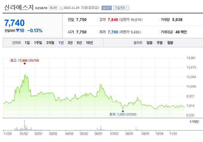 신라에스지는 식료품 기업으로 주가는 7,740원이며 전일 대비 -0.13%의 모습을 보이고 있습니다. 신라에스지의 주주현황을 살펴보면 신라홀딩스(외 3인)이 지분 58.25%를 소유하고 있습니다. 신라에스지의 시가 총액은 310억 원이며 발행 주식수는 4,000,000주 입니다. 외국인 보유 비중은 0.53% 이며 장중 거래량은 5,938을 기록했습니다. 매출액은 656억 원, 영업이익은 23억 원을 달성했습니다. EPS는 287원이며 BPS는  4,562원 입니다.
