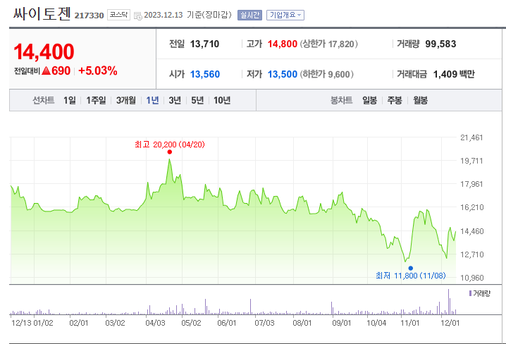 이 글에서는 싸이토젠 주가 전망과 목표 주가, 기업 정보에 대해서 설명합니다. 주식 시장에서 중요한 것은 미래의 기업 가치를 예측하고 선제적으로 움직이는 것입니다. 투자 대상을 선택하기 전에 현재 기업의 현황과 데이터를 확인하는 것이 필요합니다. 싸이토젠 주식의 주요 현황과 투자 정보를 확인하시고 주식 투자에 유용한 자료들을 정리하여 제공하오니 효율적인 투자를 해보세요.