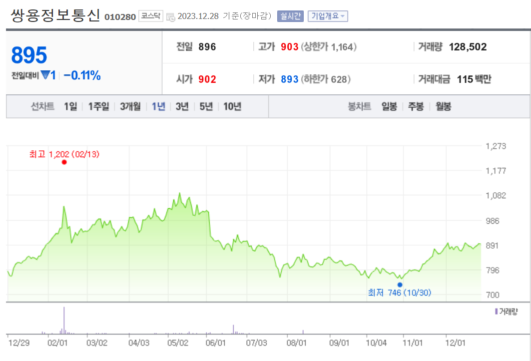 쌍용정보통신 현재 주가는 895원이며 전일 대비 -0.11%의 모습을 보이고 있습니다. 쌍용정보통신의 주주현황을 살펴보면 콤텍시스템 주주가 전체 지분 38.90%를 소유하고 있습니다. 쌍용정보통신는 IT 서비스 기업으로 시가 총액은 583억 원이며 발행 주식수는 65,123,786주 입니다. 외국인 보유 비중은 0.00% 이며 장중 거래량은 128,502를 기록했습니다. 매출액은 3,072억 원을 달성했습니다. EPS는 304원이며 BPS는 990원 입니다.