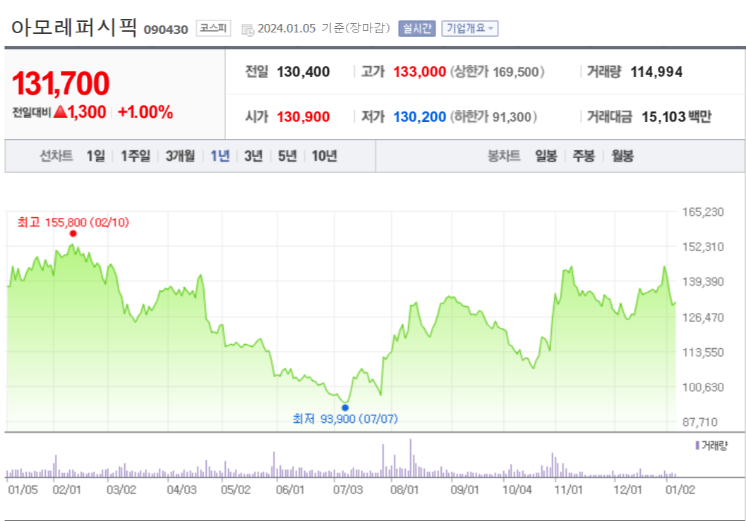 아모레퍼시픽은 현재 주가가 131,700원이며 전일 대비로 +1.00%로 소폭 상승한 상태입니다. 주주 구성을 살펴보면 아모레퍼시픽그룹 외 9인이 지분의 50.14%를 소유하고 있습니다. 아모레퍼시픽은 개인용품 제조업체로서 시가 총액은 7조7035억 원이며 코스피48위의 기업입니다. 발행된 주식 수는 58,492,759주입니다. 외국인들은 주식의 27.67%를 보유하고 있으며, 거래량은 장중에 114,994주가 기록되었습니다. 마지막으로, 회사의 매출액은 27,479억 원을 기록하였습니다.
