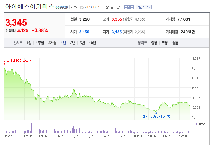 아이에스이커머스 현재 주가는 3,345원이며 전일 대비 +3.88%로 상승하는 모습을 보여줬므녀 동일업종 등락률은 +1.01%를 보여줬습니다. 아이에스이커머스의 주주현황을 살펴보면 아이에스이네트워크 주주가 전체 지분 21.43%를 소유하고 있습니다. 아이에스이커머스는 온라인쇼핑 기업으로 시가 총액은 864억 원이며 발행 주식수는 25,826,362주 입니다. 외국인 보유 비중은 0.55% 이며 장중 거래량은 77,631을 기록했습니다. 매출액은 34억 원을 달성했습니다. EPS는 -602원이며 BPS는 1,998원 입니다.