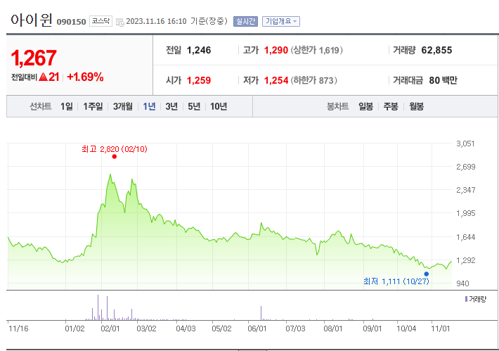 아이는 자동차부품 기업으로 가는 1,267원이며 전일 대비 +21원의 모습을 보이고 있습니다. 아이윈의 주주현황을 살펴보면 신규진(외 1인)이 지분 22.44%를 소유하고 있습니다. 아이윈의 시가 총액은 531억 원이며 발행 주식수는 41,875,293주 입니다. 외국인 보유 비중은 2.12% 이며 장중 거래량은 62,855를 기록했습니다. 매출액은 562억 원, 영업이익은 23억 원을 달성했습니다.