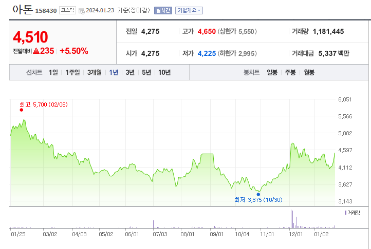 아톤 현재 주가는 4,510원이며 전일 대비 +5.50%의 모습을 보이고 있습니다. 아톤의 주주현황을 살펴보면 김종서 주주가 전체 지분 30.21%를 소유하고 있습니다. 아톤는 일반 소프트웨어 기업으로 시가 총액은 1018억 원이며 발행 주식수는 22,576,635주 입니다. 외국인 보유 비중은 1.72% 이며 장중 거래량은 1,181,445를 기록했습니다. 매출액은 415억 원을 달성했습니다.