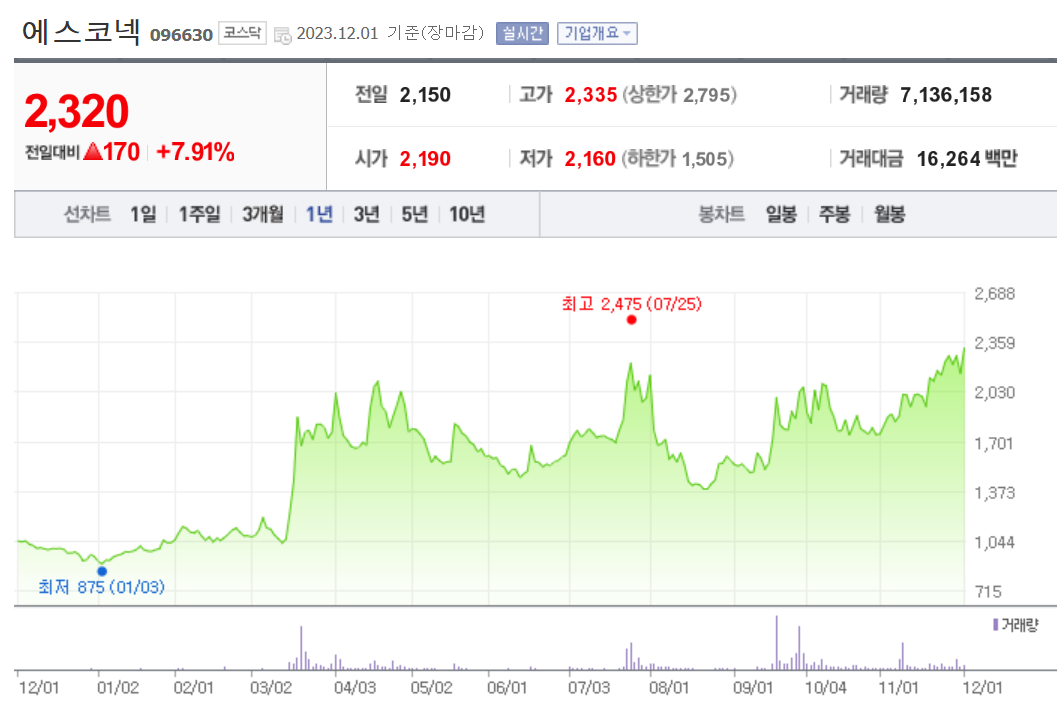 에스코넥는 휴대폰 및 관련부품 기업으로 주가는 2,320원이며 전일 대비 +7.91%원의 모습을 보이고 있습니다. 에스코넥의 주주현황을 살펴보면 박순관(외 1인)이 지분 17.22%를 소유하고 있습니다. 에스코넥의 시가 총액은 1731억 원이며 발행 주식수는 74,627,465주 입니다. 외국인 보유 비중은 1.79% 이며 장중 거래량은 7,136,158를 기록했습니다. 매출액은 1,982억 원, 영업이익은 58억 원을 달성했습니다. EPS는 -20원이며 BPS는 967원 입니다.