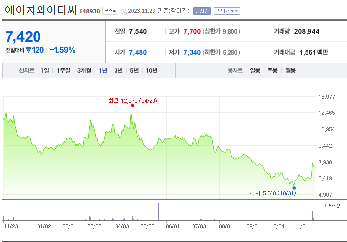 에이치와이티씨는 전자 장비 및 기기 기업으로 현재 주가는 7,420원이며 전일 대비 -1.59%의 모습을 보이고 있습니다. 에이치와이티씨의 주주현황을 살펴보면 태광(외 1인)이 지분 37.62%를 소유하고 있습니다. 에이치와이티씨의 시가 총액은 755억 원이며 발행 주식수는 10,175,213주 입니다. 외국인 보유 비중은 1.00% 이며 장중 거래량은 208,944를 기록했습니다. 매출액은 206억 원, 영업이익은 20억 원을 달성했습니다. EPS는 308원이며 PER은 24.09배이며, 동일업종 PER은 42,71배 입니다.