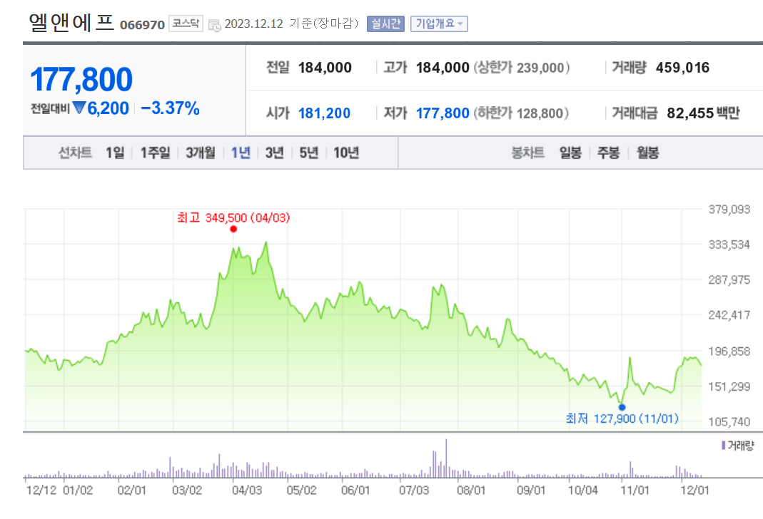 [CBC뉴스] 엘앤에프(066970)가 2거래일 약세를 이어가고 있다.엘앤에프는 12일 오후 1시 33분 현재 18만600원에 거래되고 있다. 전일대비 3400원(-1.85%) 하락한 것이다.엘앤에프는 지난 11일에도 2.13% 하락