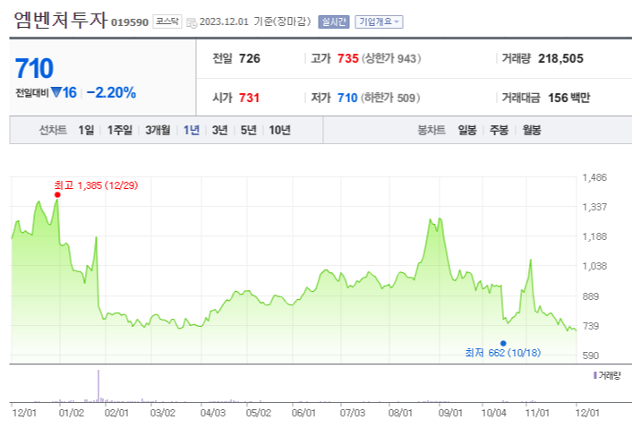 엠벤처투자는 창업투자 및 종금 기업으로 주가는 710원이며 전일 대비 -2.20%의 모습을 보이고 있습니다. 엠벤처투자의 주주현황을 살펴보면 홍성혁(외 5인)이 지분 13.97%를 소유하고 있습니다. 엠벤처투자의 시가 총액은 809억 원이며 발행 주식수는 113,966,542주 입니다. 외국인 보유 비중은 2.02% 이며 장중 거래량은 218,505를 기록했습니다. 매출액은 36억 원, 영업이익은 19억 원을 달성했습니다. EPS는 -252원이며 BPS는 537원 입니다.