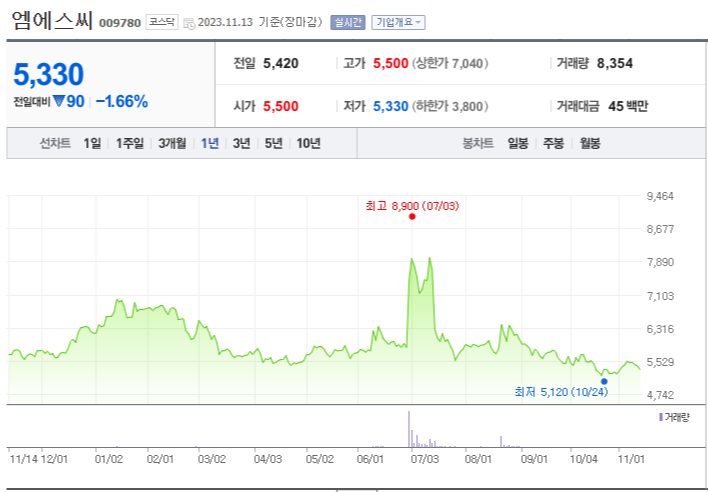 엠에스씨는 식료품 기업으로 장중 기준으로 주가는 5,330원이며 전일 대비 -90원의 모습을 보이고 있습니다. 엠에스씨의 주주현황을 살펴보면 김길제(외 7인)이 지분 73.22%를 소유하고 있습니다. 엠에스씨의 시가 총액은 938억 원이며 발행 주식수는 17,600,000주 입니다. 외국인 보유 비중은 1.37% 이며 장중 거래량은 8,354를 기록했습니다. 매출액은 938억 원, 영업이익은 247억 원을 달성했습니다. 엠에스씨 주식 배당수익률은 1.13% 입니다. 동일업종 PER은 13,73배, 등락률은 -0.37%를 보여줬습니다.