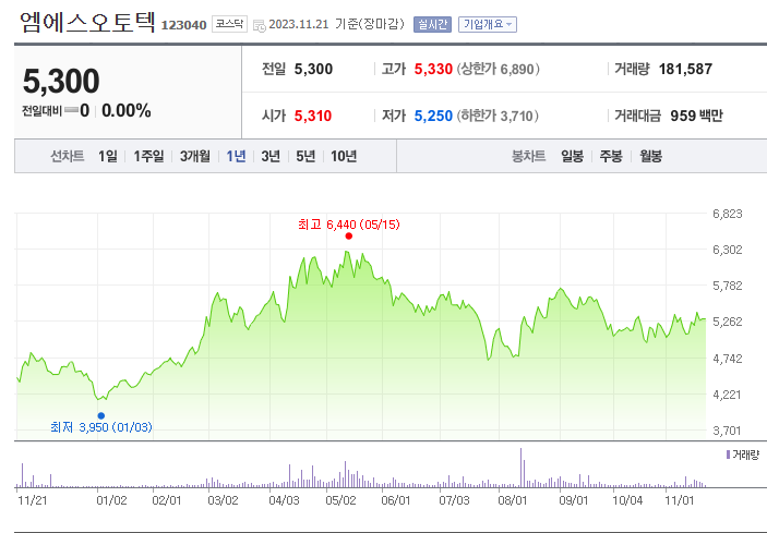 엠에스오토텍는 자동차부품 기업으로 주가는 전일과 동일한 5,300원 보였습니다. 엠에스오토텍의 주주현황을 살펴보면 심원(외 2인)이 지분 40.26%를 소유하고 있습니다. 엠에스오토텍의 시가 총액은 2420억 원이며 발행 주식수는 45,658,277주 입니다. 외국인 보유 비중은 1.82% 이며 장중 거래량은 181,587를 기록했습니다. 매출액은 17,054억 원, 영업이익은 1,491억 원을 달성했습니다. EPS는 838원이며 엠에스오토텍 주식 배당수익률은 0.94% 입니다.