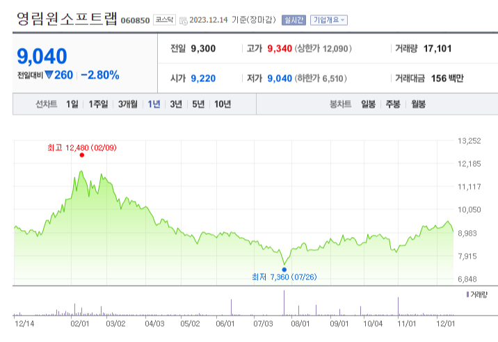영림원소프트랩 현재 주가는 9,040원이며 전일 대비 -2.80%의 모습을 보이고 있습니다. 영림원소프트랩의 주주현황을 살펴보면 권영범(외 19인)이 지분 20.31%를 소유하고 있습니다. 영림원소프트랩는 일반 소프트웨어 기업으로 시가 총액은 735억 원이며 발행 주식수는 8,131,000주 입니다. 외국인 보유 비중은 12.79% 이며 장중 거래량은 17,101을 기록했습니다. 매출액은 408억 원, 영업이익은 64억 원을 달성했습니다. EPS는 523원이며 영림원소프트랩 주식 배당수익률은 1.55% 입니다.