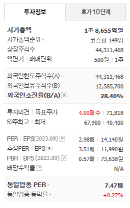 현재 영원무역의 주가는 42,100원이며 전일 대비 +0.48%의 상승세를 보이고 있습니다. 주주구성을 살펴보면 영원무역홀딩스(외 7인)이 지분의 50.74%를 소유하고 있습니다. 영원무역은 섬유 및 의복 기업으로, 시가 총액은 1조 8566억 원이고 코스피 149위 기업입니다. 발행 주식수는 44,311,468주입니다. 외국인 보유 비중은 28.40%이며, 장중 거래량은 39,745주를 기록했습니다. 또한, 매출액은 28,471억 원을 달성했습니다.