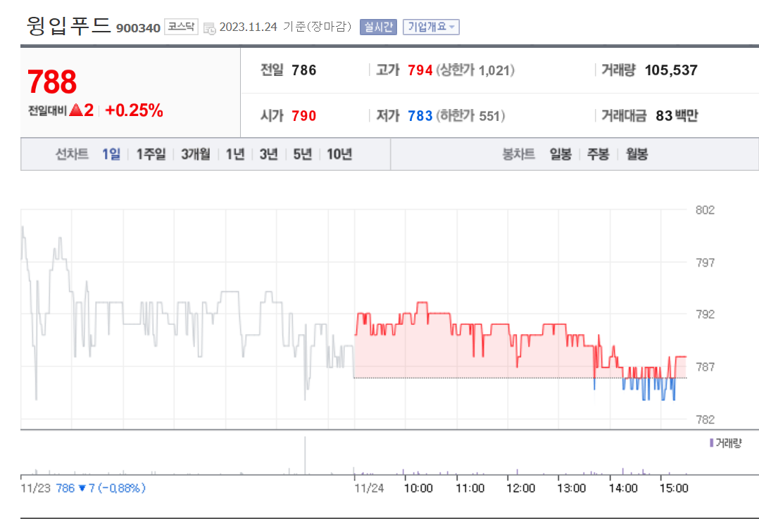 윙입푸드는 식료품 기업으로 주가는 788원이며 전일 대비 +0.25%의 모습을 보이고 있습니다. 윙입푸드의 주주현황을 살펴보면 WANG TINGFENG(외 3인)이 지분 47.42%를 소유하고 있습니다. 윙입푸드의 시가 총액은 378억 원이며 발행 주식수는 47,973,428주 입니다. 외국인 보유 비중은 49.50% 이며 장중 거래량은 105,537을 기록했습니다. 매출액은 854억 원, 영업이익은 213억 원을 달성했습니다. EPS는 307원이며 BPS는 3,658원 입니다.