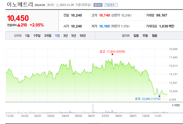 -2023년 6월 전년동기 대비 연결기준 매출액은 24.6% 증가, 영업이익 흑자전환, 당기순이익 흑자전환. 북미 지역 중심으로 파이프라인 상에 있는 대규모 프로젝트들의 단계적 발주가 예상됨에 따라 동사 매출 확대에도 긍정적인 전망 기대. 2023년 9월 미국 현지 법인 INNOMETRY USA INC. 설립계획을 공시하였으며 아시아, 유럽, 북미의 글로벌 거점으로서 주요 고객사들의 현지 이슈들을 효율적으로 대응할 예정.