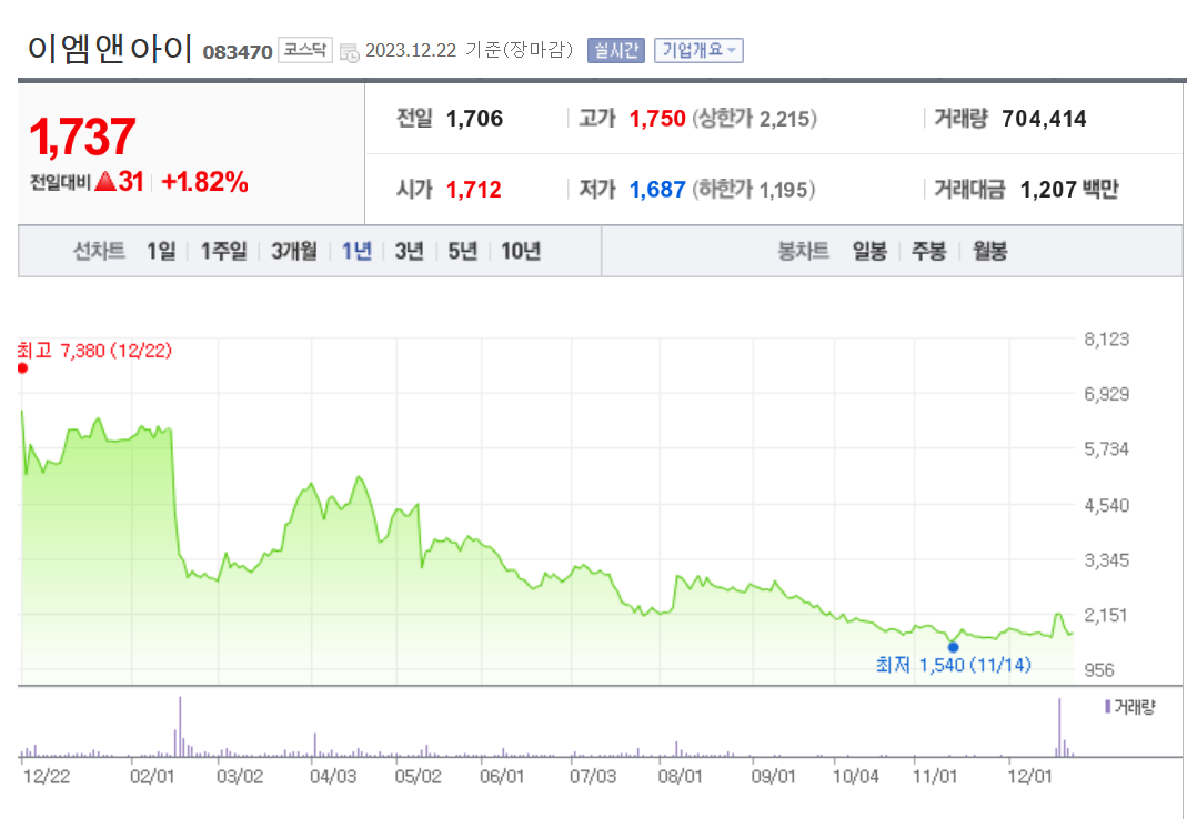 [데일리한국 김병탁 기자] 이엠앤아이가 최근 2차전지에 이어 초전도체 테마주로 주목받으며 주가가 크게 요동치고 있다. 하지만 아직까지 관련 실적은 전무하며, 시설 투자 역시 자금조달의 어