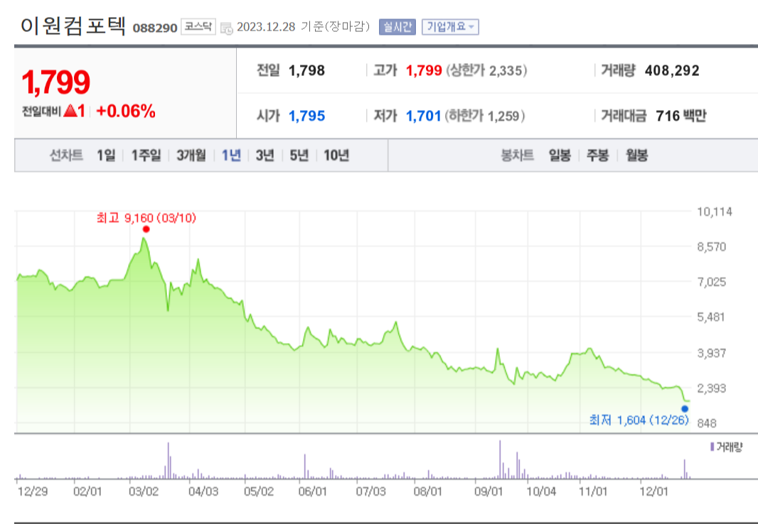 [핀포인트뉴스 한강희 기자] 이원컴포텍이 지난 한주간 큰 폭의 하락세를 기록했다. 29일 한국거래소에 따르면 이원컴포텍 주가는 지난 28일 1799원에 마감했다. 이에 따라 일주일 전인 12월 22일