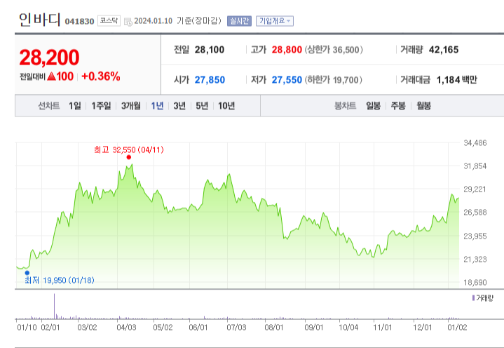 인바디 현재 주가는 28,200원이며 전일 대비 +0.36%의 모습을 보이고 있습니다. 인바디의 주주현황을 살펴보면 차기철 주주가 전체 지분 28.70%를 소유하고 있습니다. 인바디는 의료 장비 및 서비스 기업으로 인바디의 시가 총액은 3859억 원이며 발행 주식수는 13,683,782주 입니다. 외국인 보유 비중은 36.45% 이며 장중 거래량은 42,165를 기록했습니다. 매출액은 1,284억 원을 달성했습니다.