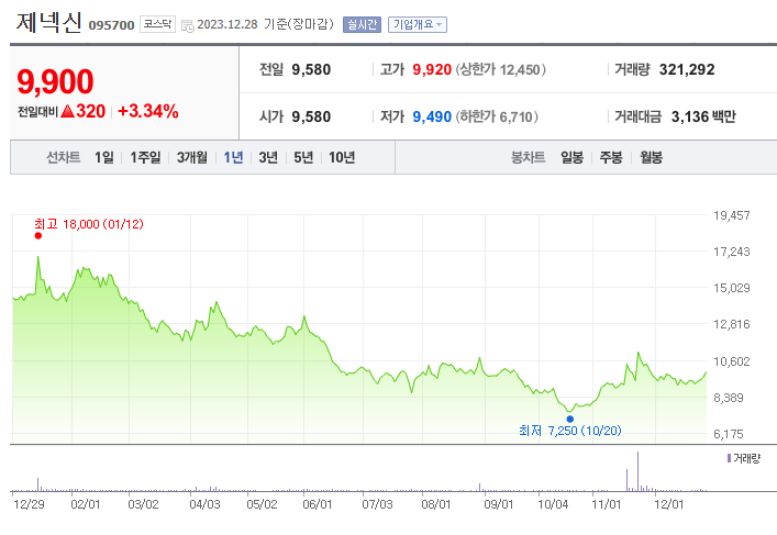 제넥신 현재 주가는 9,900원이며 전일 대비 +3.34%의 모습을 보이고 있습니다. 제넥신의 주주현황을 살펴보면 한독 주주가 전체 지분 14.58%를 소유하고 있습니다. 제넥신는 바이오 기업으로 시가 총액은 4110억 원이며 발행 주식수는 41,510,594주 입니다. 외국인 보유 비중은 5.33% 이며 장중 거래량은 321,292를 기록했습니다. 매출액은 29억 원을 달성했습니다. EPS는 -2,767원이며 BPS는 7,104원 입니다.