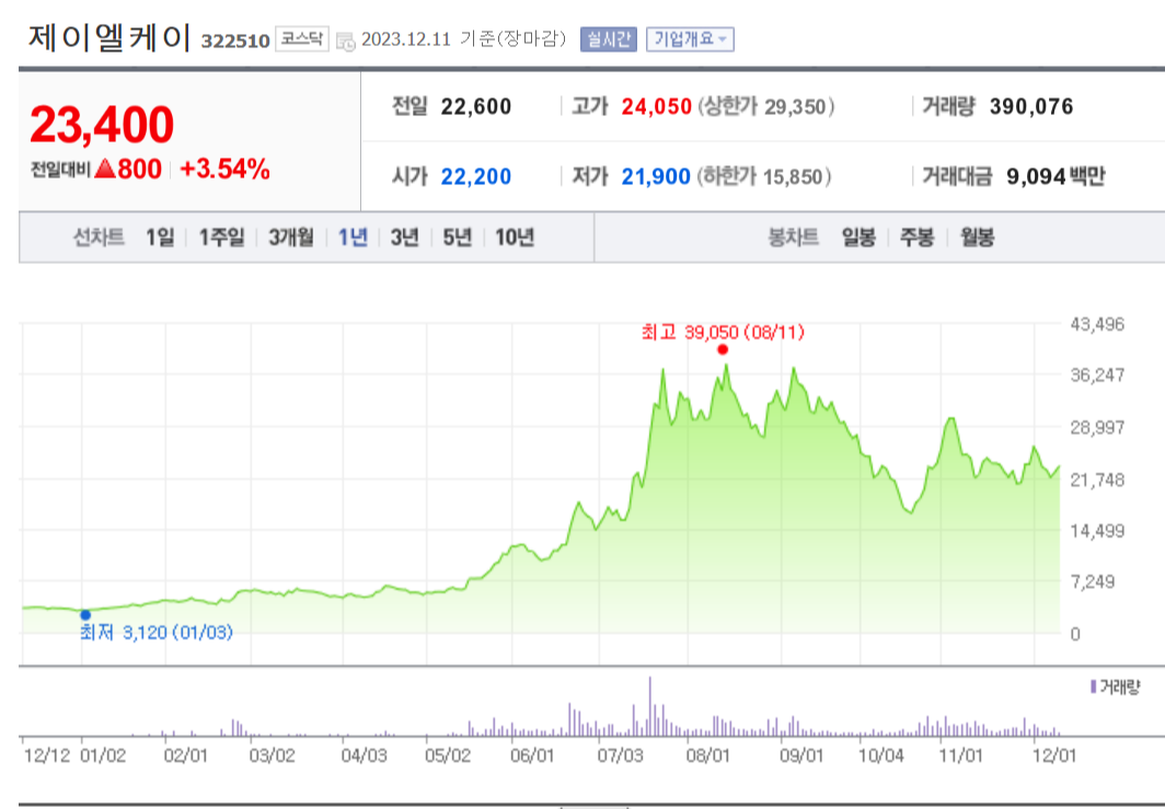 제이엘케이는 의료 장비 및 서비스 기업으로 주가는 23,400원이며 전일 대비 +3.54%의 모습을 보이고 있습니다. 제이엘케이의 주주현황을 살펴보면 김원태(외 1인)이 지분 25.70%를 소유하고 있습니다. 제이엘케이의 시가 총액은 3783억 원이며 발행 주식수는 16,167,712주 입니다. 외국인 보유 비중은 1.31% 이며 장중 거래량은 390,076을 기록했습니다. 매출액은 15억 원, 영업이익은 -86억 원을 달성했습니다. EPS는 -436원이며 BPS는 829원 입니다.