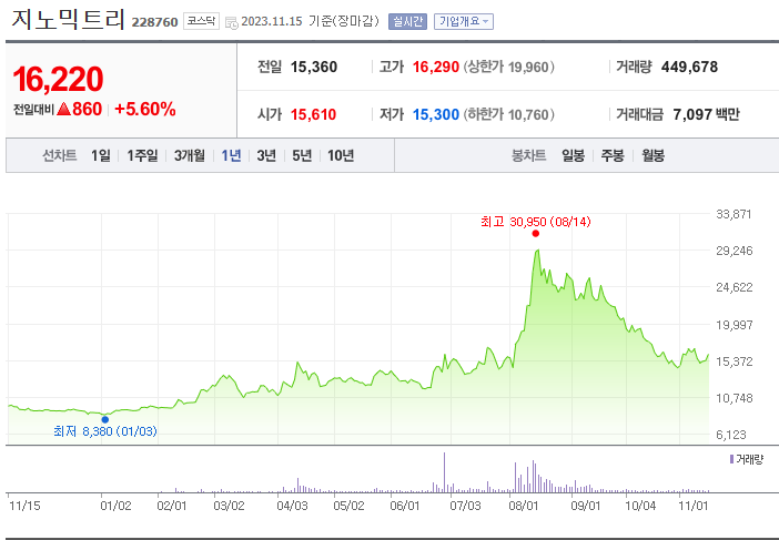 지노믹트리는 의료 장비 및 서비스 기업으로 현재 주가는 16,220원이며 전일 대비 +860원의 모습을 보이고 있습니다. 지노믹트리의 주주현황을 살펴보면 안성환(외 16인)이 지분 18.12%를 소유하고 있습니다. 지노믹트리의 시가 총액은 3,895억 원이며 발행 주식수는 24,012,334주 입니다. 외국인 보유 비중은 3.53% 이며 장중 거래량은 449,678를 기록했습니다. 매출액은 22억 원, 영업이익은 24억 원을 달성했습니다. 동일업종 등락률은 +1.74%를 나타냈습니다.