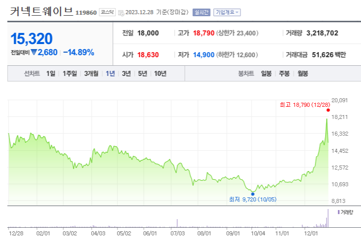 커넥트웨이브, 오전 갑작스런 15% 급락…상승 행진 멈추나 < 증시 < 경제 < 기사본문 - 이코노뉴스 (econonews.co.kr)